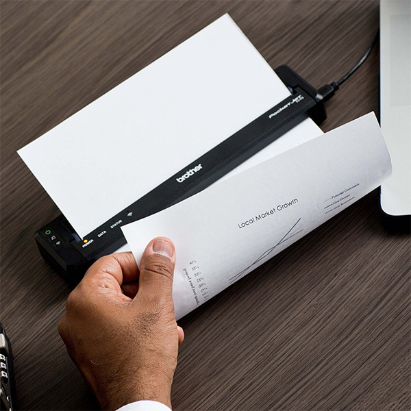 Brother PJ-773 is a very compact mobile printer with wifi . Make prints at any location with a resolution of 300 dpi . This way, field workers can easily print an invoice or contract at the customer. Frequently used documents can be saved. The portable printer does not require ink; the print appears by heat on the thermal paper. Choose from A4 sheets or a paper roll with holder. The PocketJet can be connected via USB to your laptop or via wifi to your Android or iOS smartphone or tablet (including support for AirPrint, Cloud Print, Wi-Fi Direct and the Brother app).
